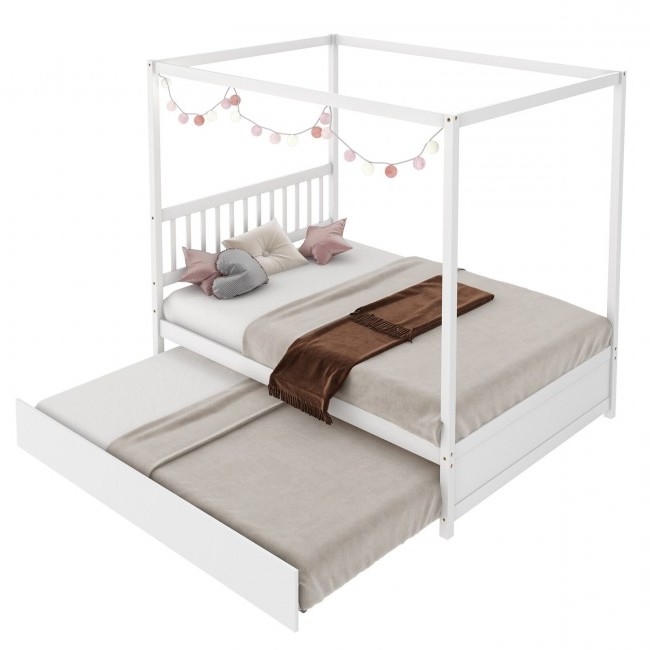 Home > White Full Size Canopy Platform Bed with Twin Roller Trundle Bed