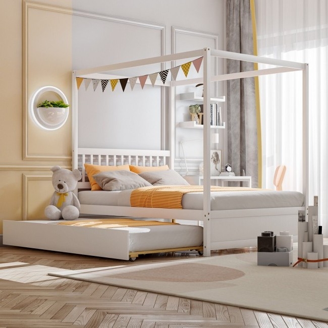 White Full Size Canopy Platform Bed with Twin Roller Trundle Bed
