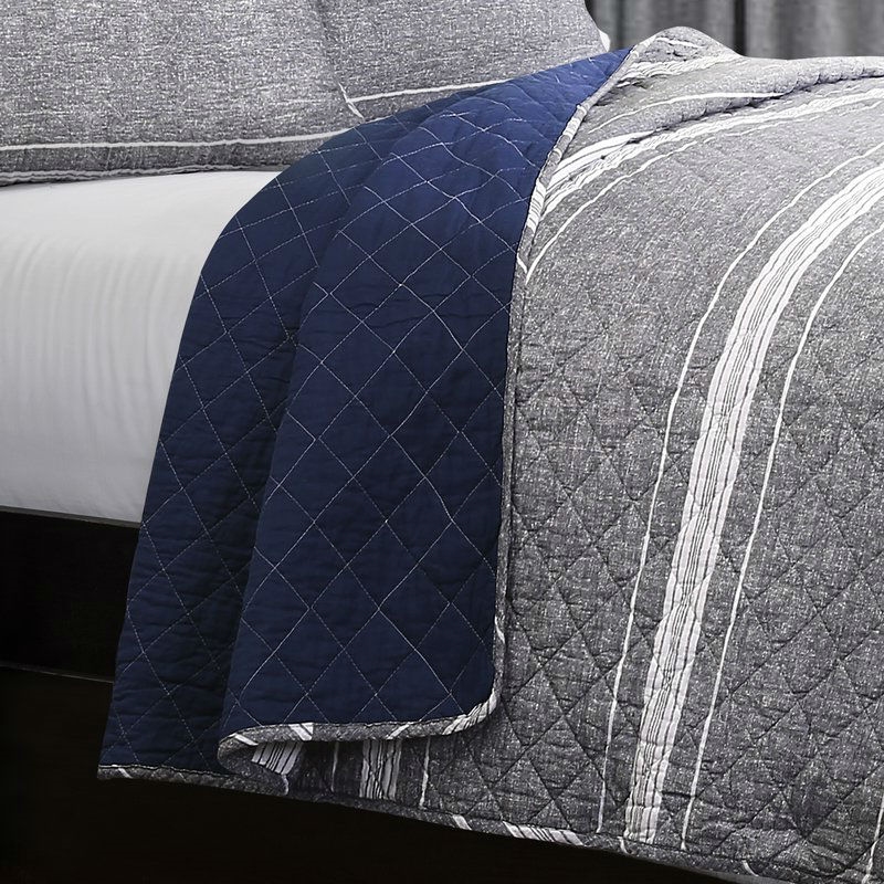 Queen Gray Navy Stripe Motif 100% Cotton Reversible Quilt Coverlet Bedspread Set Queen Gray Navy Stripe Motif 100% Cotton Reversible Quilt Coverlet Bedspread Set Queen Gray Navy Stripe Motif 100% Cotton Reversible Quilt Coverlet Bedspread Set